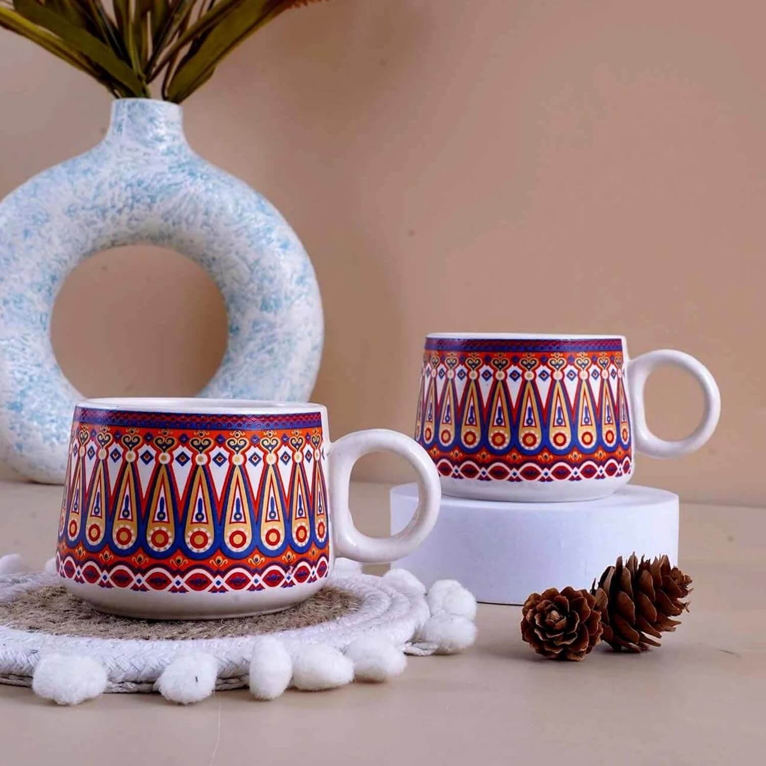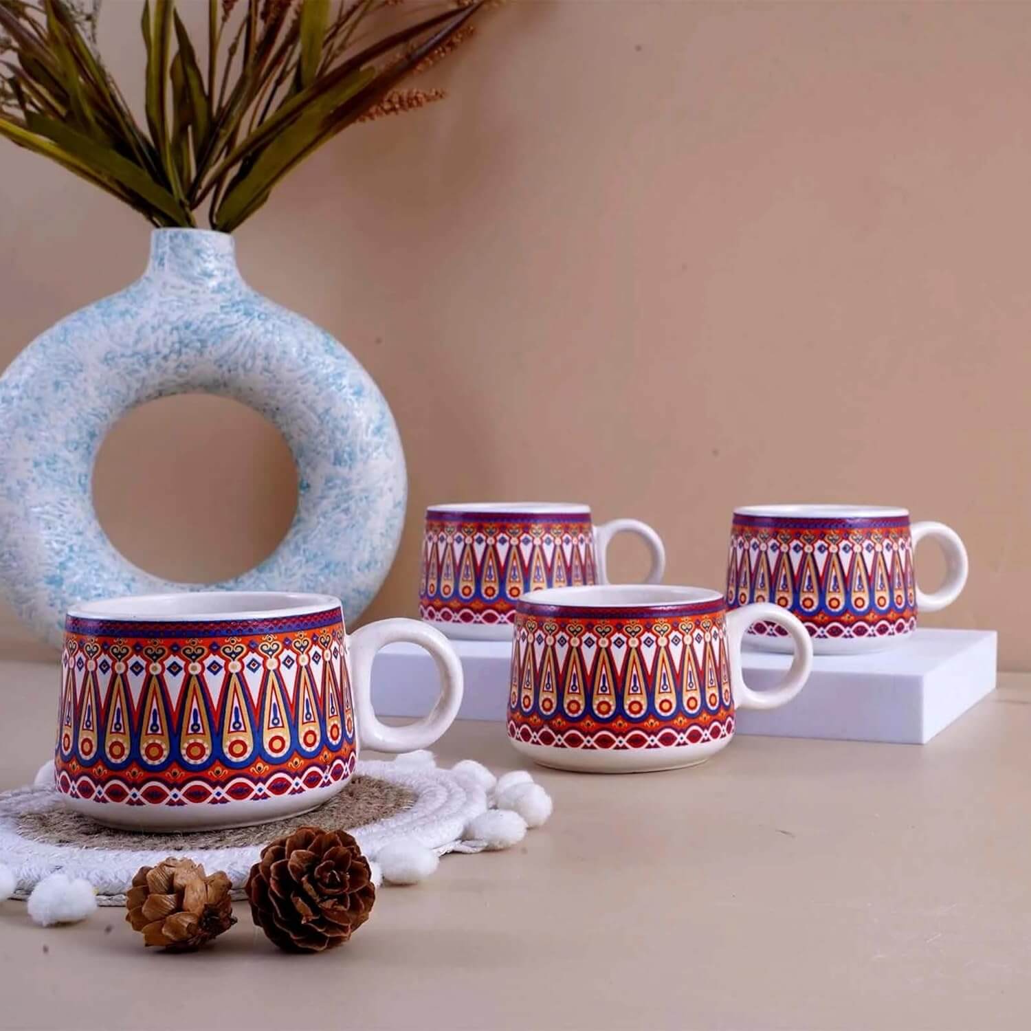 Celebrate the vibrancy of Indian heritage with this premium ceramic cup set, featuring six hand-painted mugs adorned with traditional geometric patterns. Each piece is kiln-fired and glazed for durability, making it perfect for daily chai, coffee, or festive gatherings. Lightweight, microwave-safe, and crafted with care, this set brings artistry to your everyday rituals.
