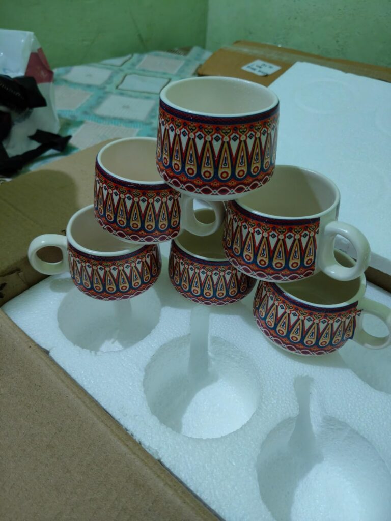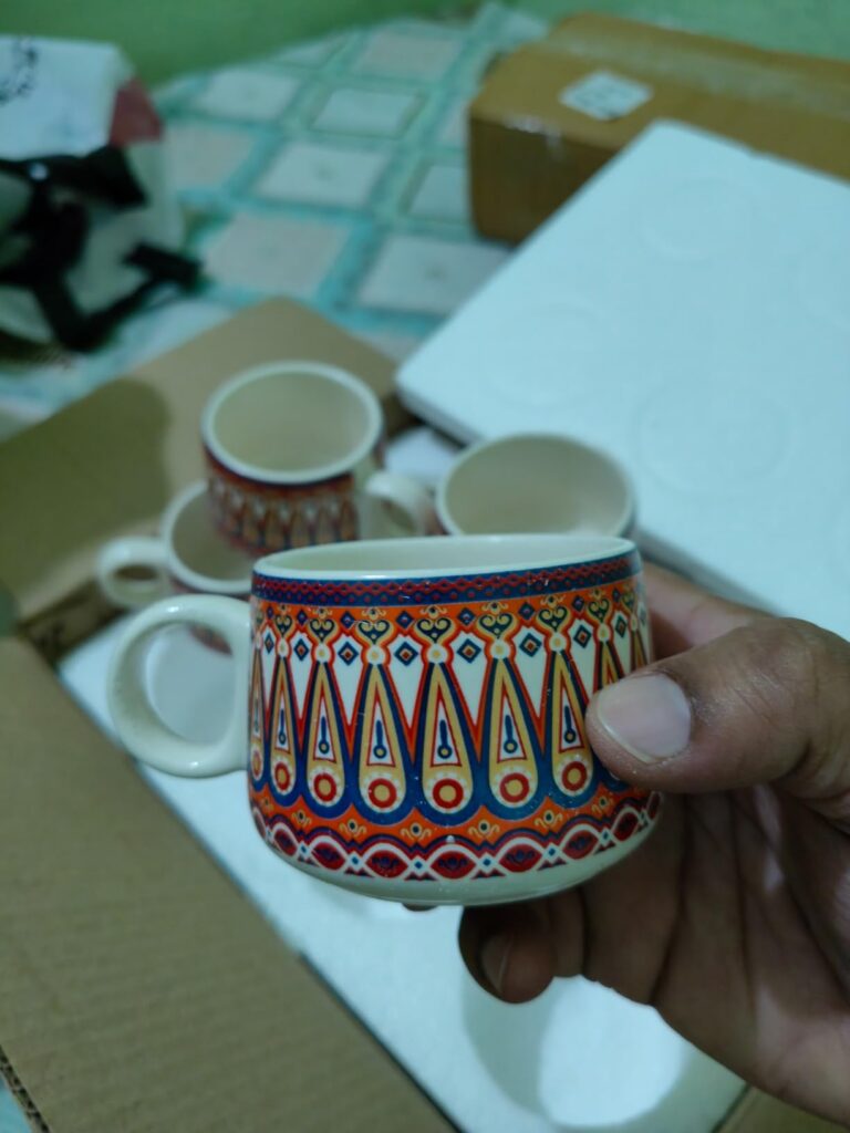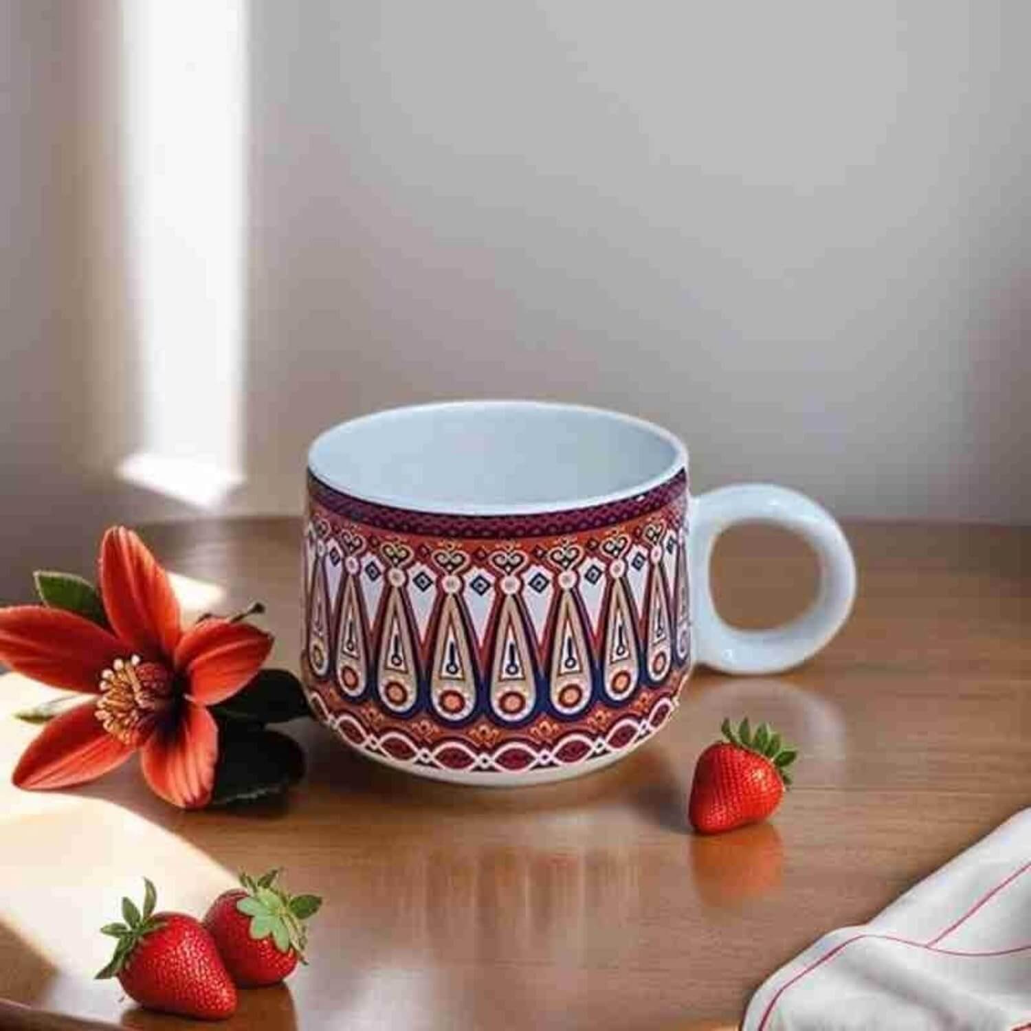 Har cup ka design ekdum vibrant aur traditional feel deta hai! Microwave safe hone ki wajah se rozana use easy ho gaya. Ceramic quality thick hai aur grip bhi comfortable hai. Ghar ke décor ke saath bhi match karta hai.